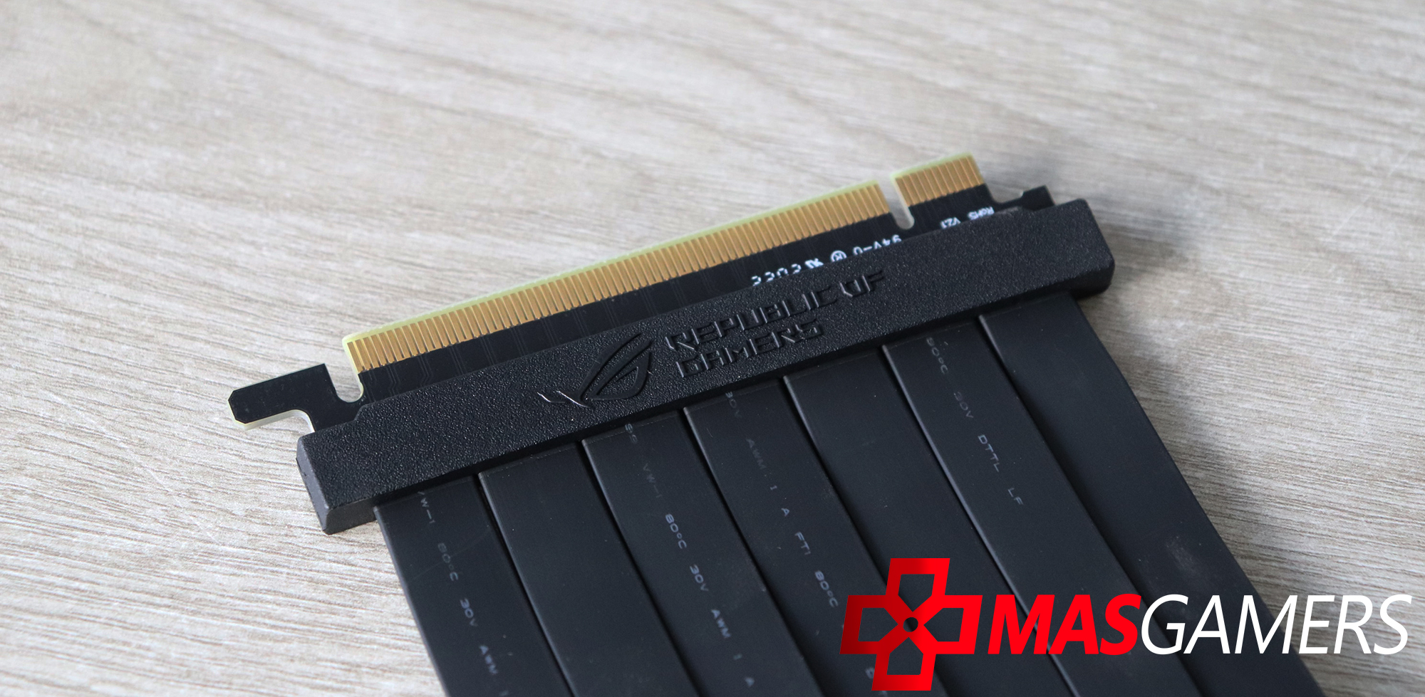 El cable riser de ROG tiene un diseño delgado, plano y plegable le permite acomodarse a nuestro case y también como vemos en la imagen, tiene un refuerzo / aislamiento en la parte donde se produce la unión del cable con el conector destinado a ir a la motherboard.