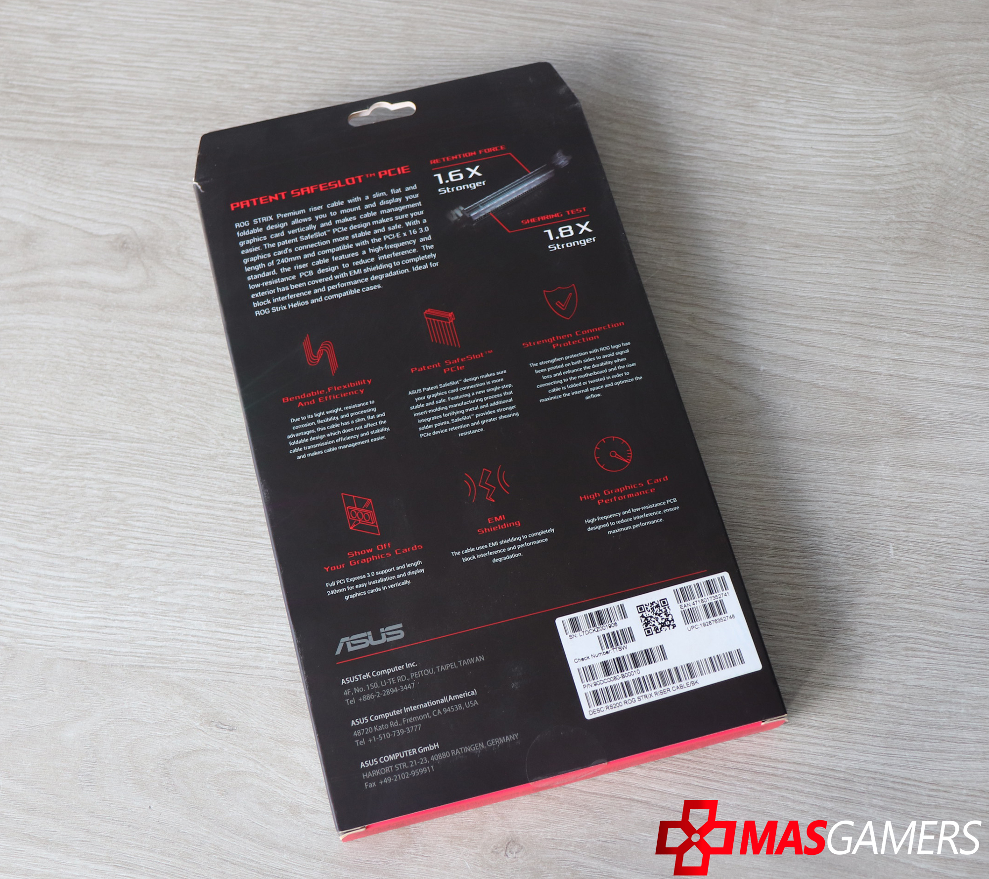 El empaque que protege a nuestro riser tiene la temática clásica ROG aunque con un pequeño rediseño, pero manteniendo los colores básicos en rojo y negro, mostrando su diseño en el frontal y sus principales características y especificaciones técnicas en el reverso.