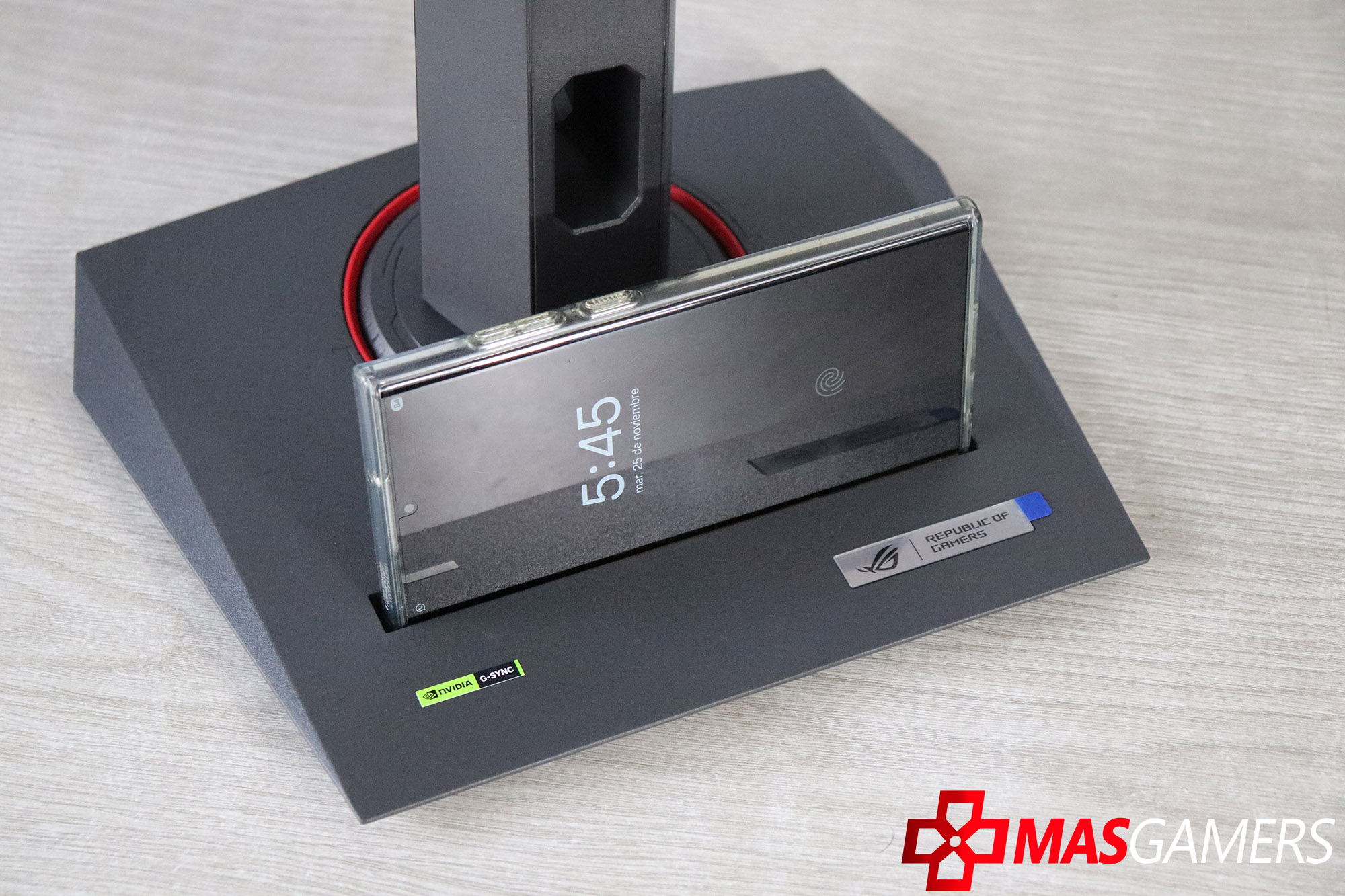 También en la base encontramos la pegatina que nos recuerda que este monitor es «G-Sync», lo que garantiza una sincronización óptima si estamos usando una tarjeta de vídeo GeForce.