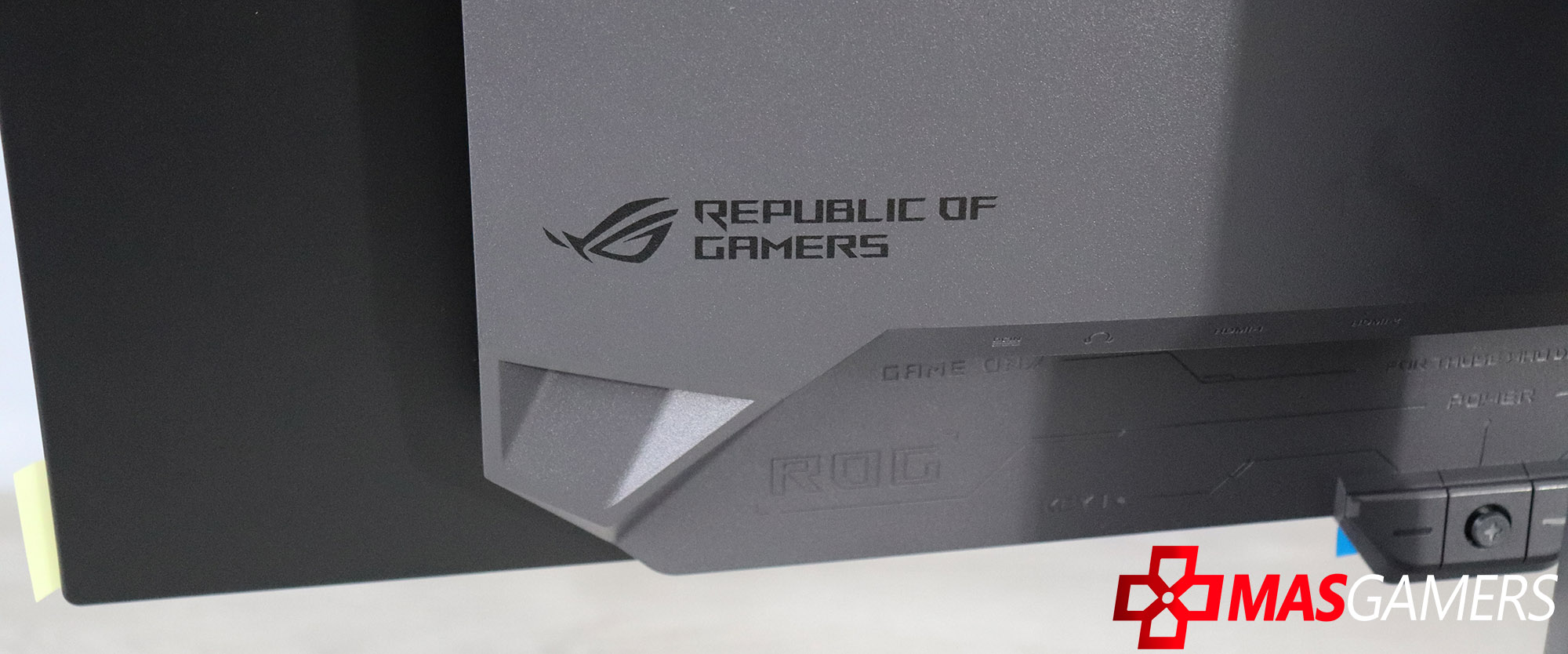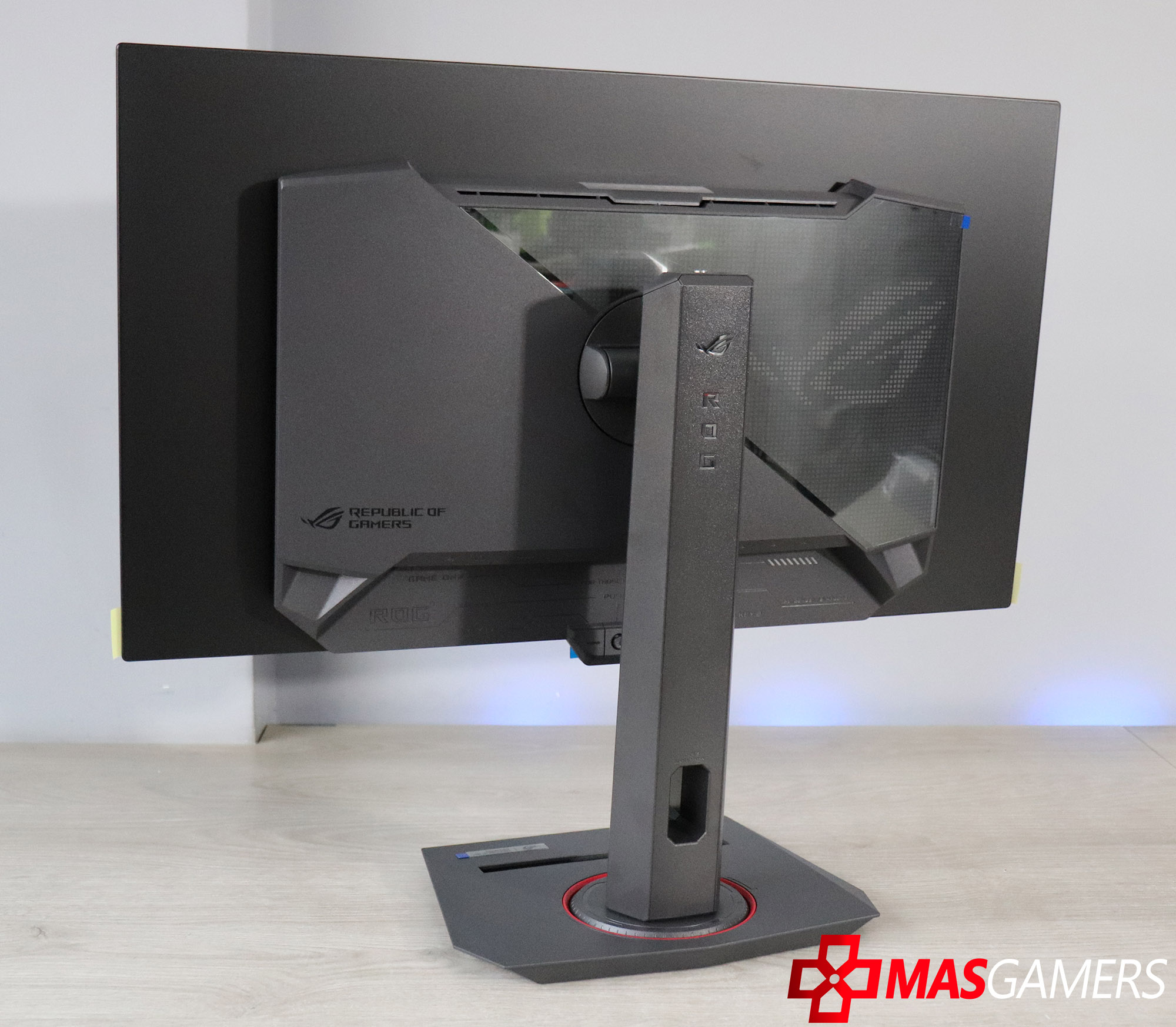 En la parte trasera, la carcasa muestra un diseño más dinámico, con detalles angulares, el logotipo ROG y acentos que incluyen iluminación RGB para aportar un toque personalizado al setup. La estructura está bien ventilada, con ranuras que forman parte del sistema térmico del monitor, necesario para mantener temperaturas adecuadas en un panel OLED de alto brillo.