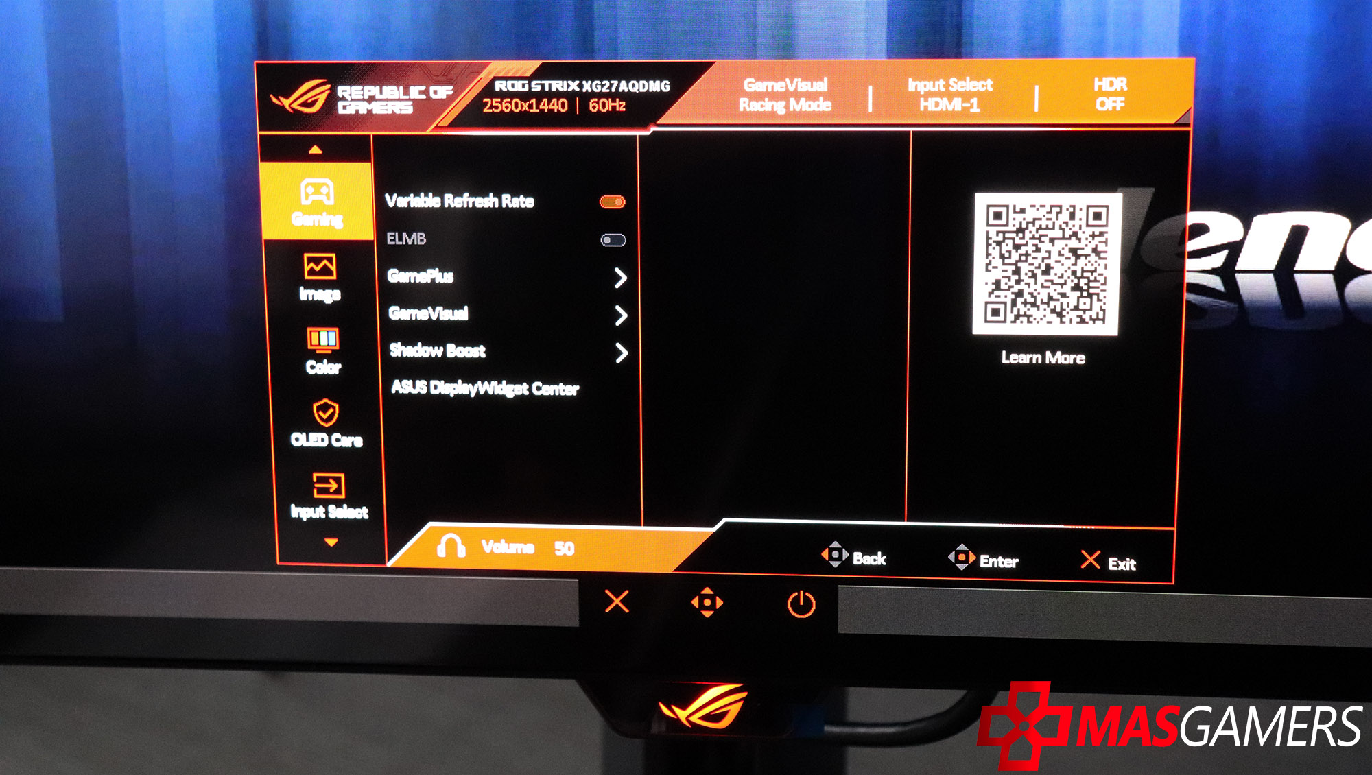 El ASUS ROG Swift OLED XG27AQMG incorpora iluminación RGB («Aura RGB Lights») en la parte posterior.