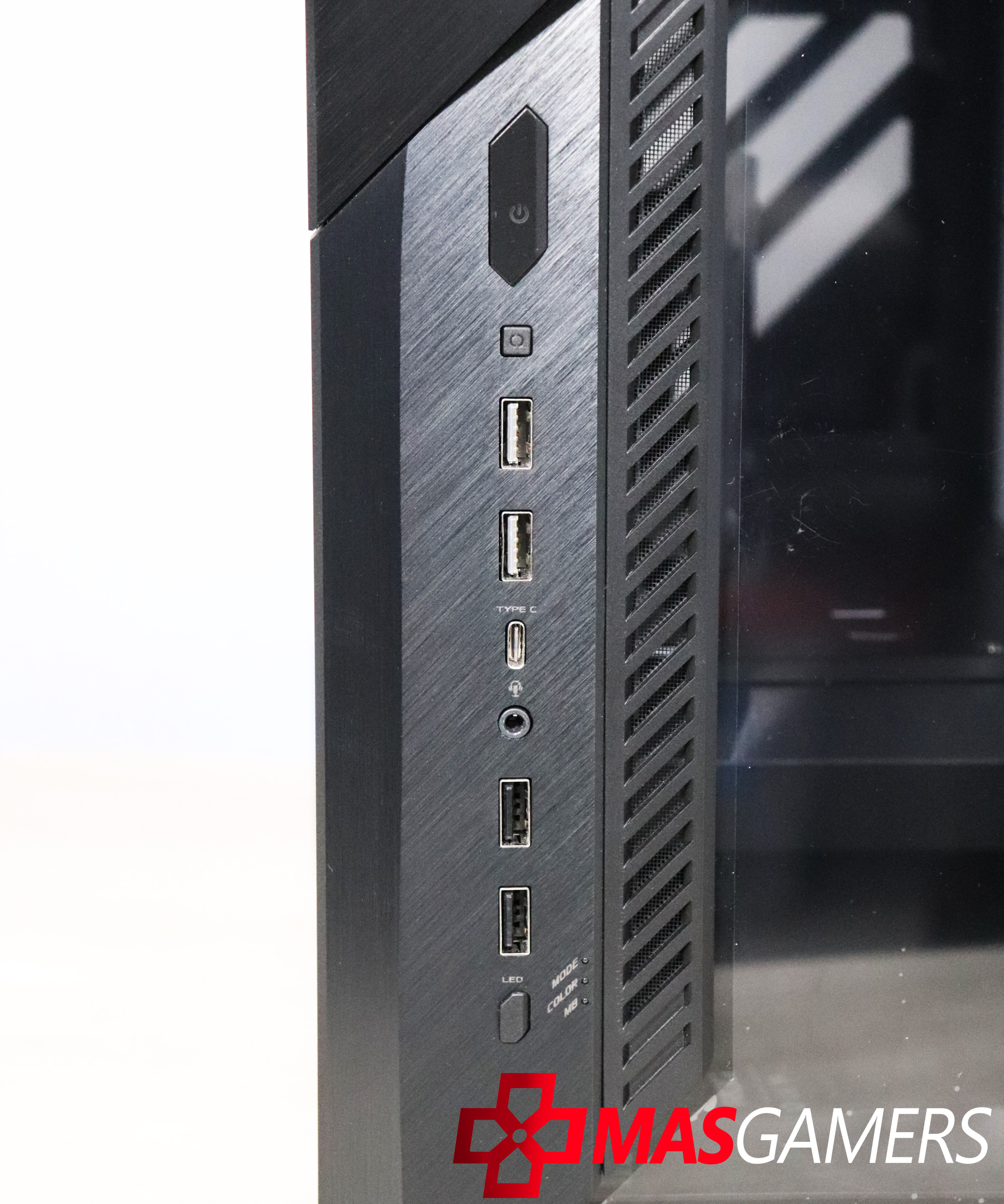 Empezando con los detalles, vemos que en la panel frontal contamos con 2 puertos USB de alta velocidad, acompañados con un puerto tipo C, un conector de auriculares + micrófono, 2 puertos USB 2.0 y el clásico set de botones.