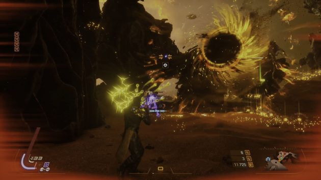 Estamos ante un juego de disparos en el que debemos apuntar mientras analizamos constantemente el entorno, evitando que cualquier proyectil nos alcance. A diferencia de Returnal, donde el frenesí de los combates se limitaba a acciones más básicas, en Saros tendremos que aprovechar todos nuestros recursos: ganchos, teletransportador y escudo. Este último destaca como una gran novedad, ya que puede usarse tanto para bloquear ataques como para hacer parrys, aunque no funciona con todos los proyectiles. Para esos casos, contamos con el dash, que nos permite atravesar ciertos tipos de balas.