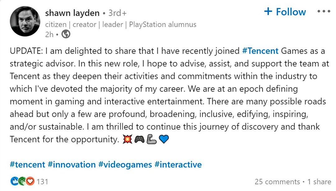 Parecía que Layden, tras su retiro de Sony, iba a estar fuera de la industria de los videojuegos. Sin embargo, el descanso ha terminado, y hoy es una de las nuevas figuras que acaba de unirse a Tencent Games, la división de uno de los conglomerados más grandes de China.
