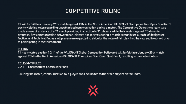 Valorant inicio su escena competitiva con el primer VCT Open Qualifier. Durante la primera etapa del circuito profesional, el equipo de T1 quedo eliminado, luego de que el equipo de Riot Games encontró un fallo dentro de la partida que disputaron.